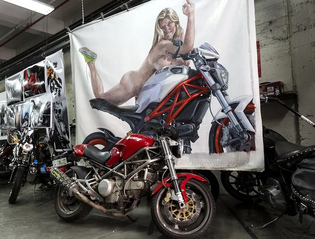 ‘Ducati Monster’, oil on canvas, 70” x 102”; installation at MotorGrrl, Brooklyn, NY