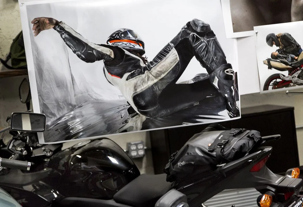 ‘Ducati Lover’, photo-collage, 96” x 40”; installation at MotorGrrl, Brooklyn, NY
